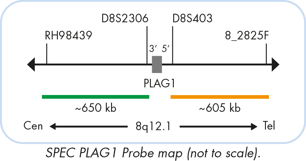 The ZytoLight SPEC PLAG1 Dual Color Break Apart Probe (PL280) is intended to be used for the qualitative detection of rearrangements involving the human PLAG1 gene at 8q12.1 in formalin-fixed, paraffin-embedded specimens by fluorescence in situ hybridization (FISH). The probe is intended to be used in combination with the ZytoLight FISH-Tissue Implementation Kit (Prod. No. Z-2028-5/-20).